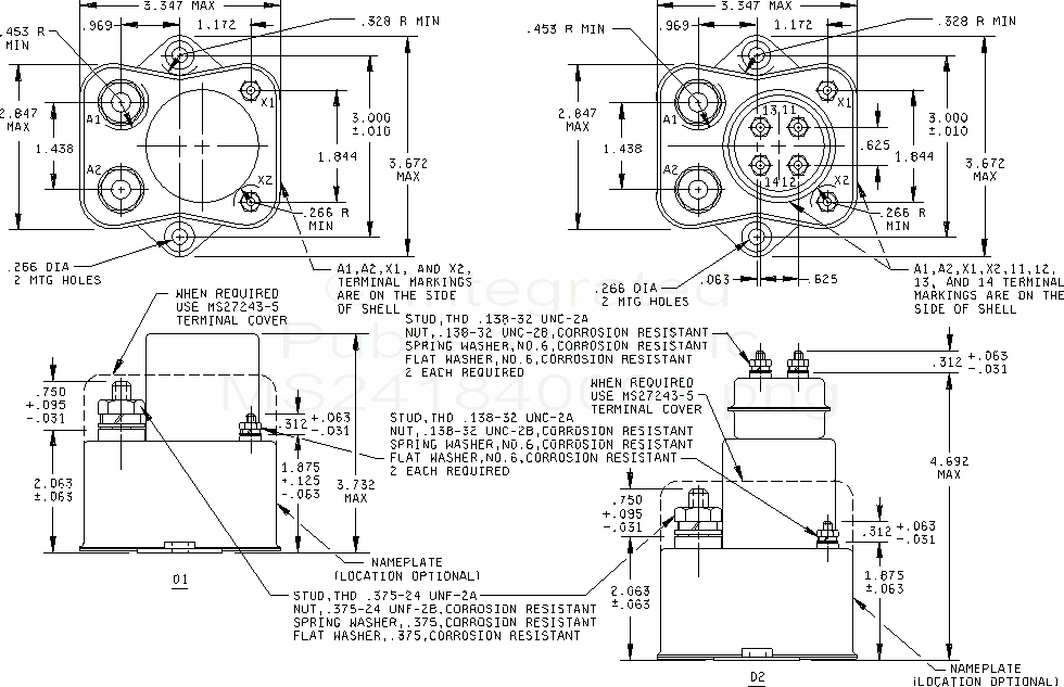 MS24184 Relays, Electromagnetic, 300 Amperes, 1 Pst (N.O.), Type I, With Auxiliary Contacts, Hermetically Sealed